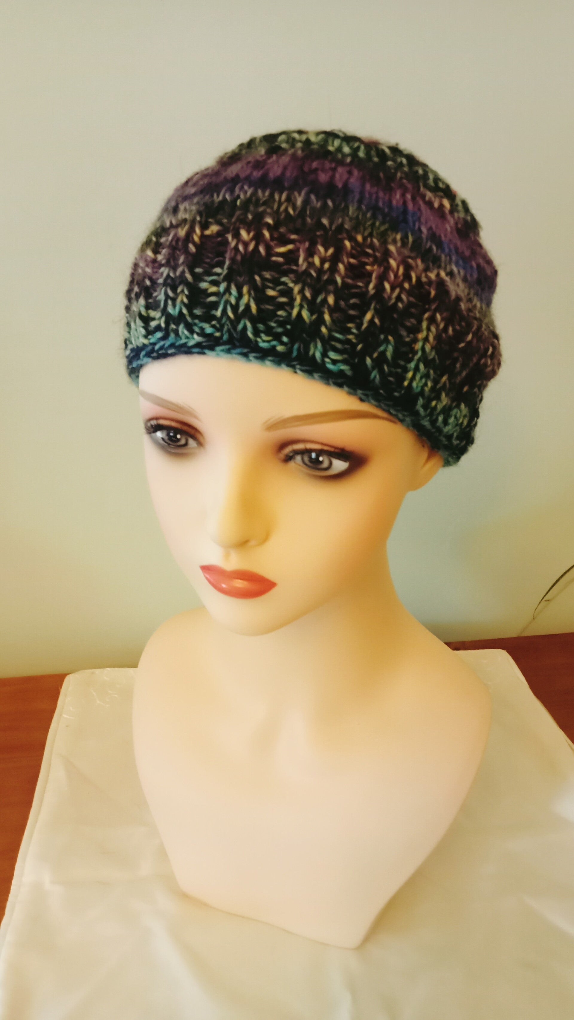 This warm woollen hat is Woven, then has a crochet section - and finally, knitted! A lot of green in this one !